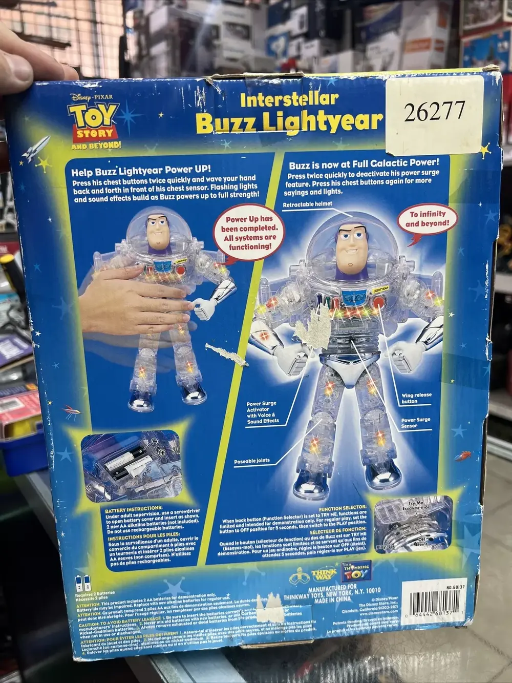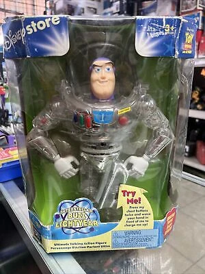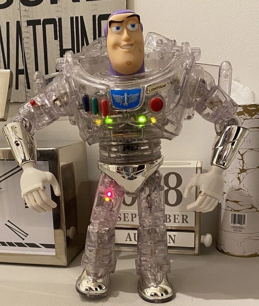 Lastly, we have this Buzz from the Disney Store that is clear/red/blue. This Buzz is titled "Buzz Lightyear Space Rescue" and looks really cool when he lights up after you push his buttons. I remember we had this one as well as children.